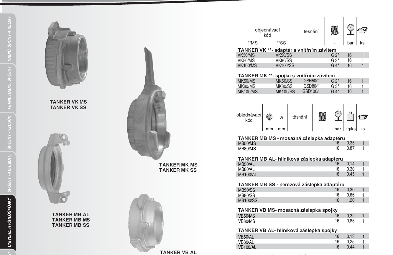 Univerzální rychlospojkový systém pro mnohé aplikace v průmyslu, zemědělství a u cisternové dopravy. Spojka se jednoduše utahuje na principu samosvorného spoje - šroubovice adaptéru proti věnci rychlospojky s pákou. Pojistka páky se zaklesne do prstence, což zamezuje uvolnění spojky při vibracích a pohybu hadice běhěm čerpání. Systém odpovídá normě DIN 28 450. Nerezovém provedení s těsněním z Hypalonu. TANKER je možné osadit a aplikovat jak s Hadicovými trny AG, tak i s Hadicovými trny DIN 2817.