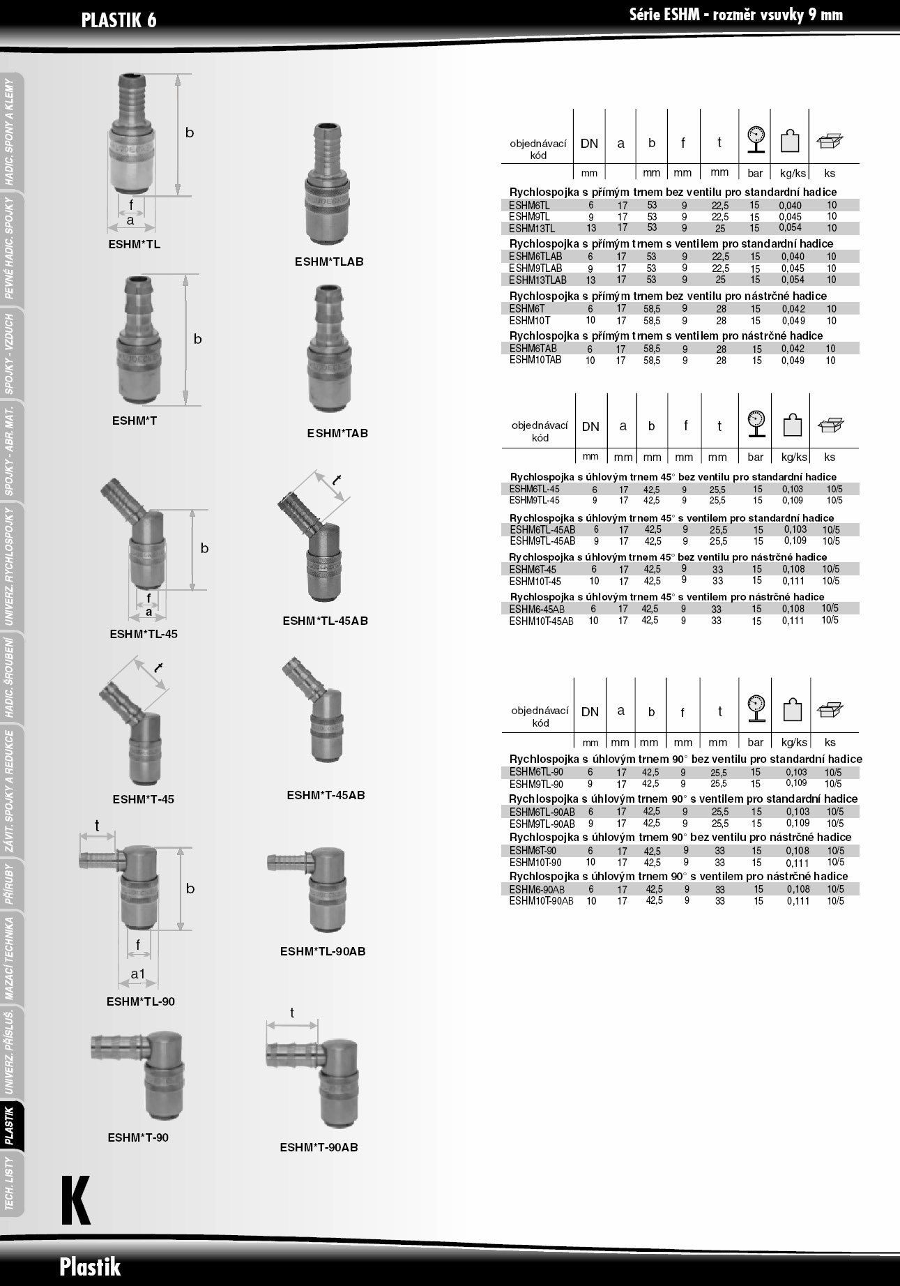 Rychlospojky určené pro plastikářské stroje a formy s volným průchodem. Pro aplikace udržení stále teploty horkou a studenou vodou, popřípadě temperovacím olejem. Kompatibilní s Hasco Z8. Mosazné tělo, a objímka, vnitřní část z nerezové oceli, těsnění viton. Rychlospojka Plastik mini s úhlovým trnem 45° bez ventilu pro standardní hadice.