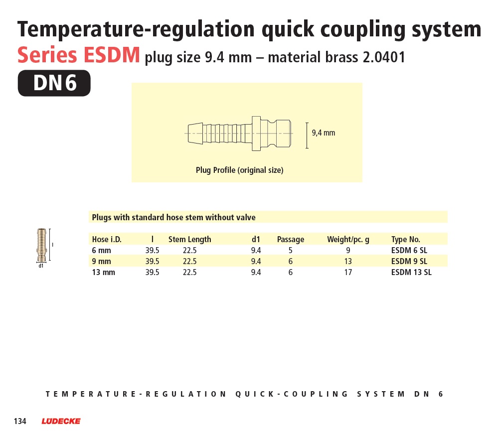 Rychlospojky této série jsou určeny pro trny a vsuvky stejné série ESDM s velikostí čepu trnu 9,4 mm. Systém ESDM je plně kompatibilní s americkým systémem DME 1/4", nikoliv Hasco. Rychlospojky určené pro plastikářské stroje a formy s volným průchodem. Pro aplikace udržení stále teploty horkou a studenou vodou, popřípadě temperovacím olejem. Vsuvka Dn 6 s trnem bez ventilu s průměrem čepu 9,4 mm.
