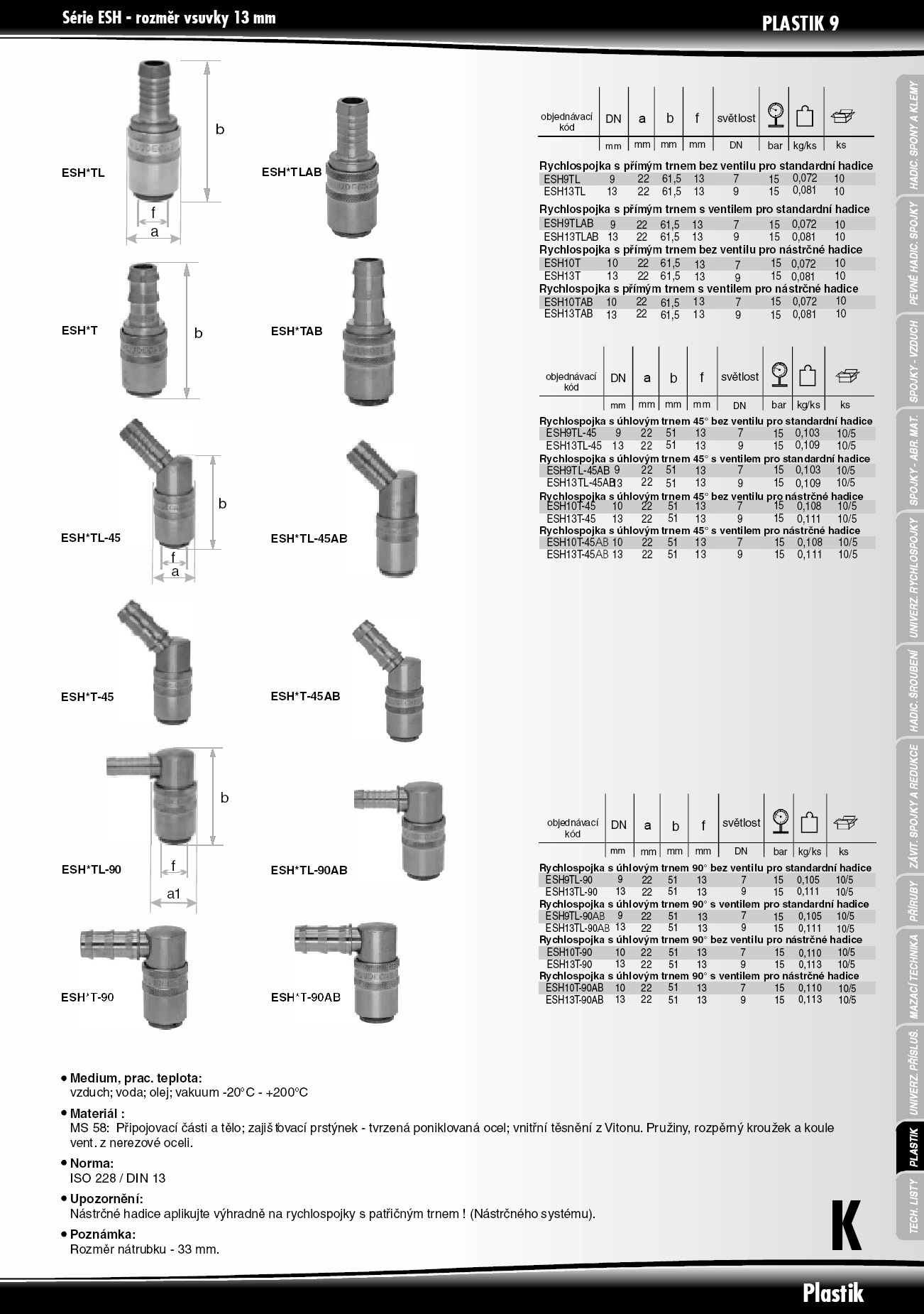 Rychlospojky určené pro plastikářské stroje a formy s volným průchodem. Pro aplikace udržení stále teploty horkou a studenou vodou, popřípadě temperovacím olejem. Kompatibilní s Hasco Z8. Mosazné tělo, a objímka, vnitřní část z nerezové oceli, těsnění viton. Rychlospojka Plastik Dn 9 s přímým trnem bez ventilu pro standardní hadice. Délka trnu 25 mm, rozměr vsuvky 13 mm.
