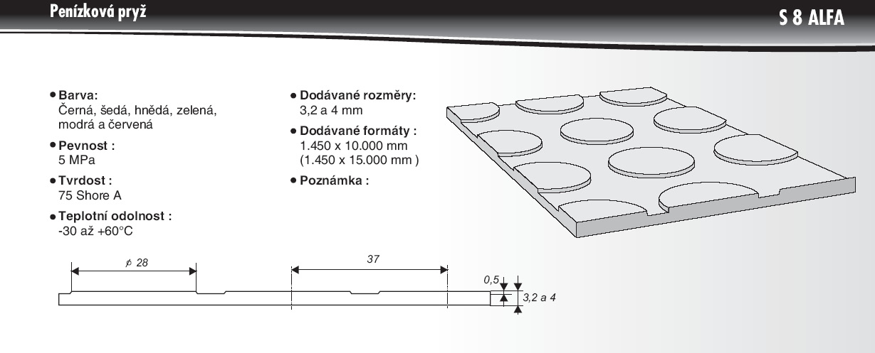 Barvy : S8A-003/145-75185 - černá; S8A-003/145-75685 - šedá; S8A-003/145-75585 - zelená S8A-003/145-75485 - červená S8A-003/145-75385 - modrá S8A-003/145-75885 - hnědá Nejrozšířenější podhlahová pryž používaná u vozidel přepravující osoby nebo v průmyslu všeobecně